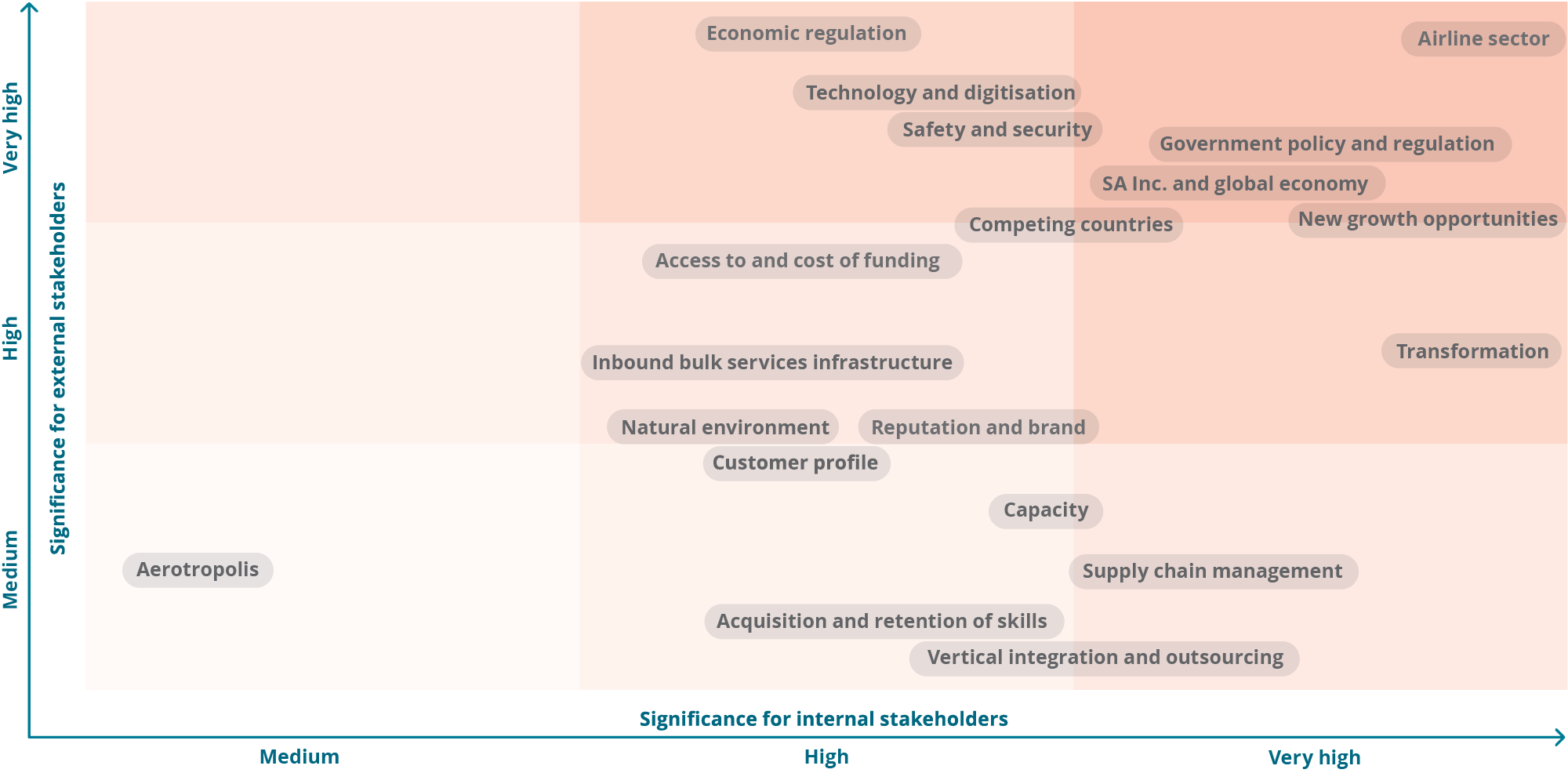 Material matters are prioritised according to the magnitude of the effect on the Group’s strategy, governance, performance and prospects. We place emphasis on these material matters, with a focus on our strategic response, importance to stakeholders, the risks and opportunities, and the outcomes and trade-offs. The below matrix ranks material matters in terms of the level of significance, determined by their likelihood and magnitude, in relation to internal and external stakeholders.